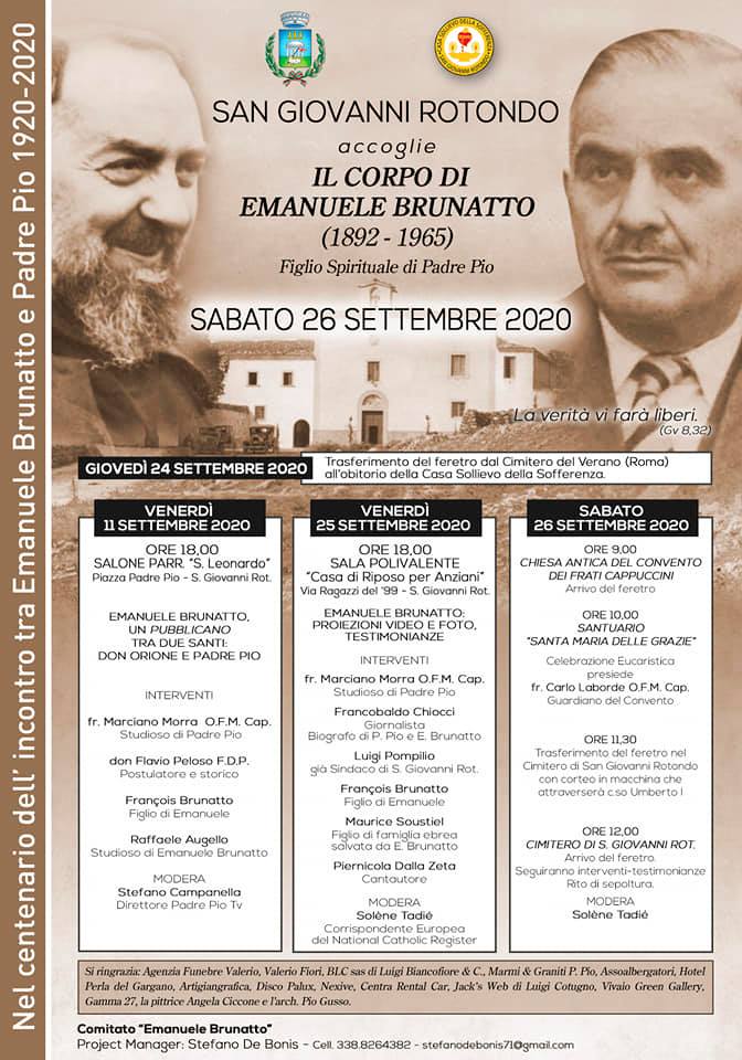 La salma viene trasferita da Roma al cimitero di San Giovanni Rotondo a cento anni dall’incontro tra Brunatto e Padre Pio nella chiesa antica dei frati cappuccini di San Giovanni Rotondo (1920-2020). – CLICCA QUI per leggere il Comunicato Ufficiale del “Comitato Emanuele Brunatto”.
